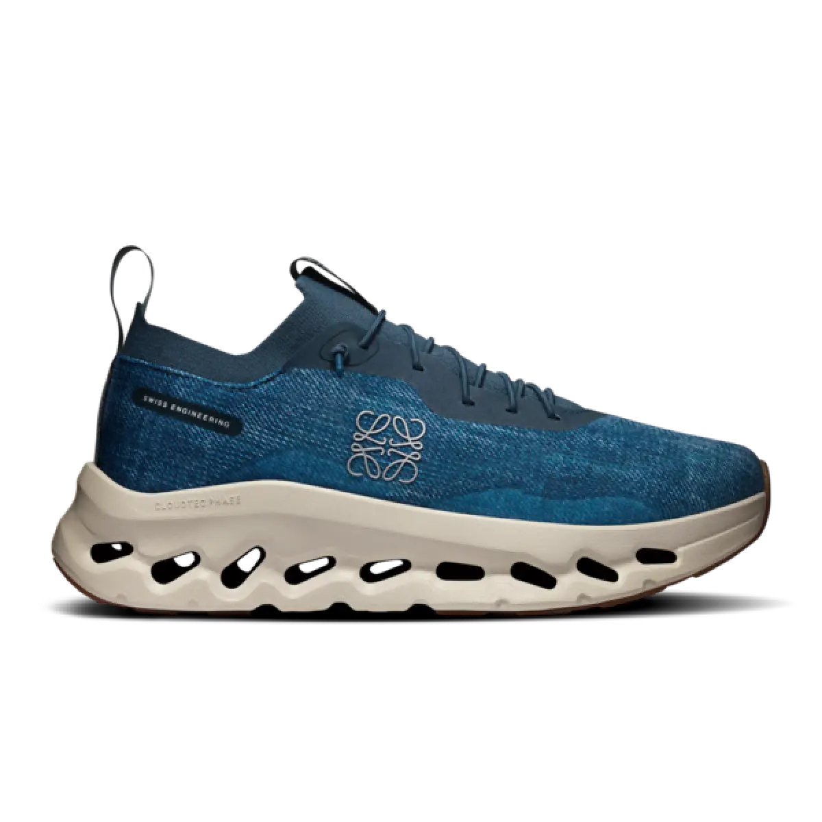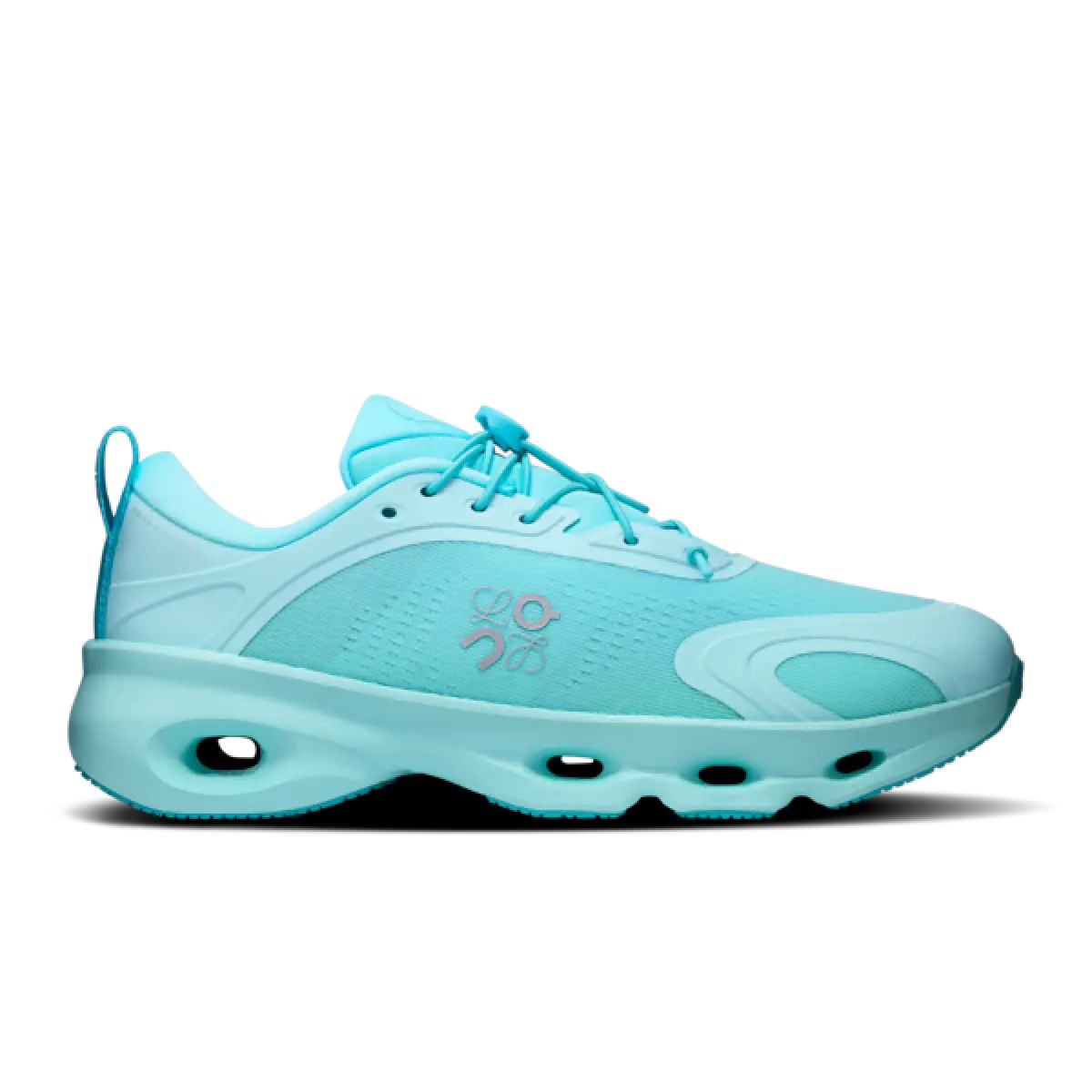 Bagian atasnya menampilkan tali toggle pebble bermerek Loewe dan jaring teknis On, yang terbuat dari benang semi-transparan. Alas kaki flagship ini juga dirancang dengan tali elastis yang dapat disesuaikan dan logo Loewe × On.