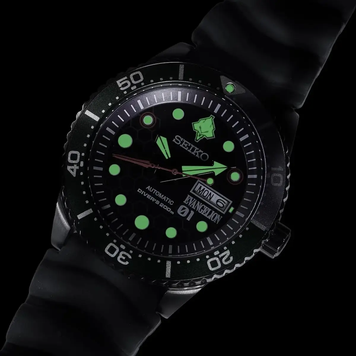 Posisi pukul 12 menunjukkan kepala EVA-01, sementara posisi pukul 2 dan 10 terlihat seperti bagian dada mecha. Tali jam tangan Seiko C038 VA-01 Diver’s Watch Limited Edition terbuat dari silikon, sedangkan kacanya terbuat dari Hardlex.