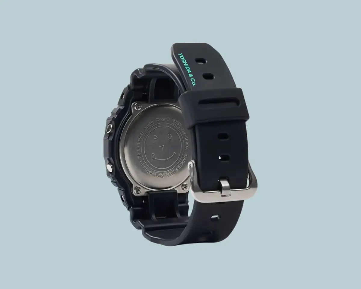 Sementara itu, wajah tersenyum khas merek tersebut terukir di bagian belakang casing baja tahan karat, sedangkan tali jam resin dicetak dengan logo "POTR" dan "Yoshida & Co.".