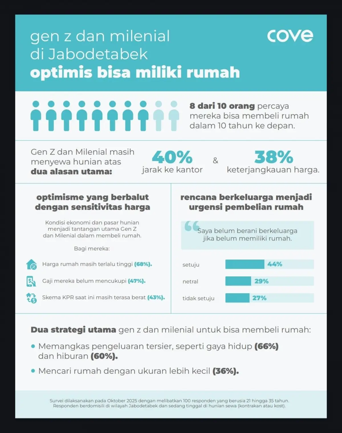 Techverse.asia - Cove resmi melansir hasil studi terbarunya yang mengungkap lebih dari 80 persen percaya bahwa generasi Milenial dan generasi Z bisa beli rumah dalam waktu 10 tahun ke depan. Di balik kepercayaan ini, studi tersebut juga menemukan beberapa kekhawatiran ihwal kepemilikan rumah, seperti harga properti, bujet yang cukup, dan peran rumah dalam membangun keluarga.