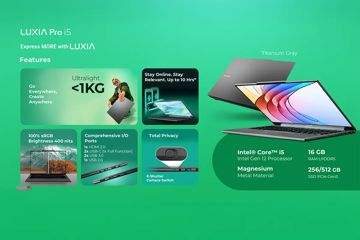 Ditenagai oleh Intel Core i5, serta Intel Iris Xe Graphics, Luxia Pro i5 memungkinkan proses sunting foto dan video lebih mulus dan cepat. Layar 14 inci IPS WUXGA dengan kualitas warna 100 persen sRGB dan kecerahan 400 nits menjadikannya ideal untuk memvisualisasikan karya seni digital dengan presisi tinggi.