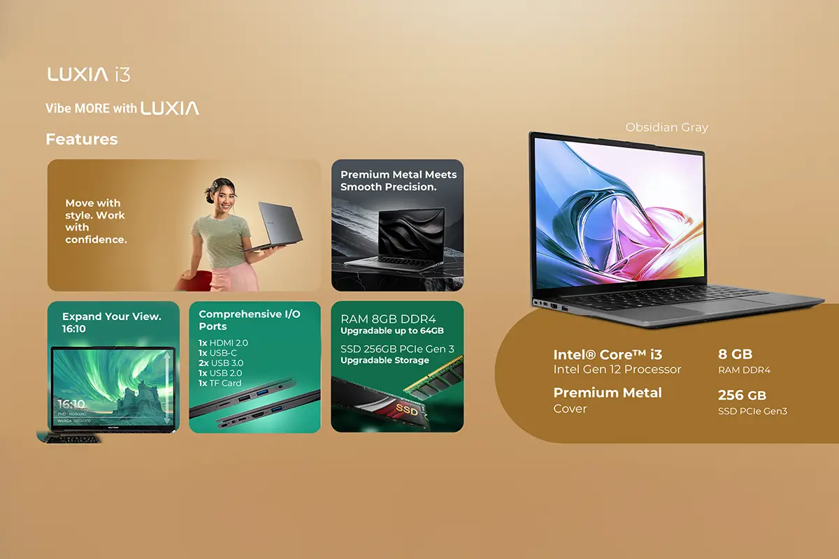 Layarnya hadir dengan dan kecerahan 400 nits membuatnya sangat cocok untuk bekerja atau menikmati konten visual dengan jernih. Dengan porta HDMI 2.0, USB-C Full Function, USB 3.0, dan USB 2.0, Luxia i3 memberikan fleksibilitas untuk menghubungkan berbagai perangkat eksternal, mendukung produktivitas penggunanya sepanjang hari.