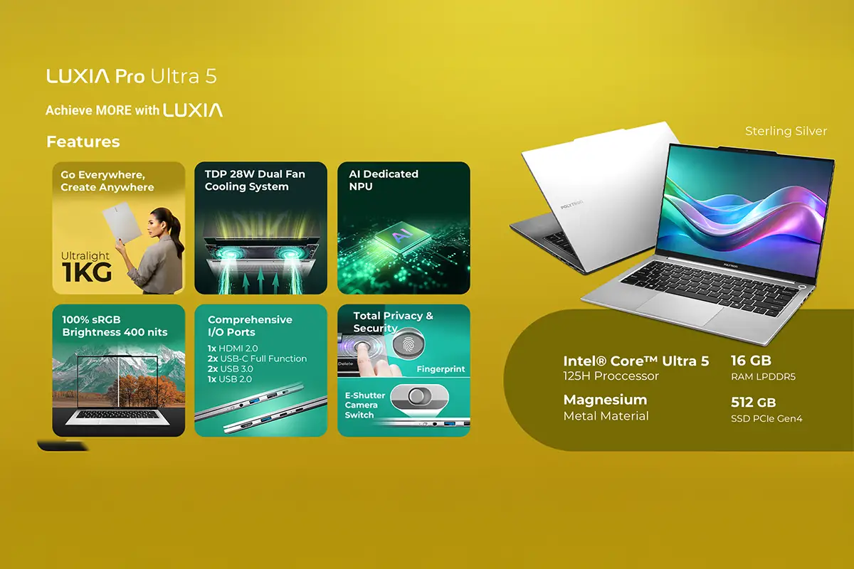 Pertama, Polytron Luxia Pro Ultra 5 dirancang dengan desain premium dan performa bertenaga, yang ditenagai oleh prosesor Intel Core Ultra 5 yang didukung oleh AI Dedicated NPU dan Intel ARC untuk kinerja grafis superior. Dibalut dalam material magnesium, laptop ini hanya berbobot 1 kilogram (kg).