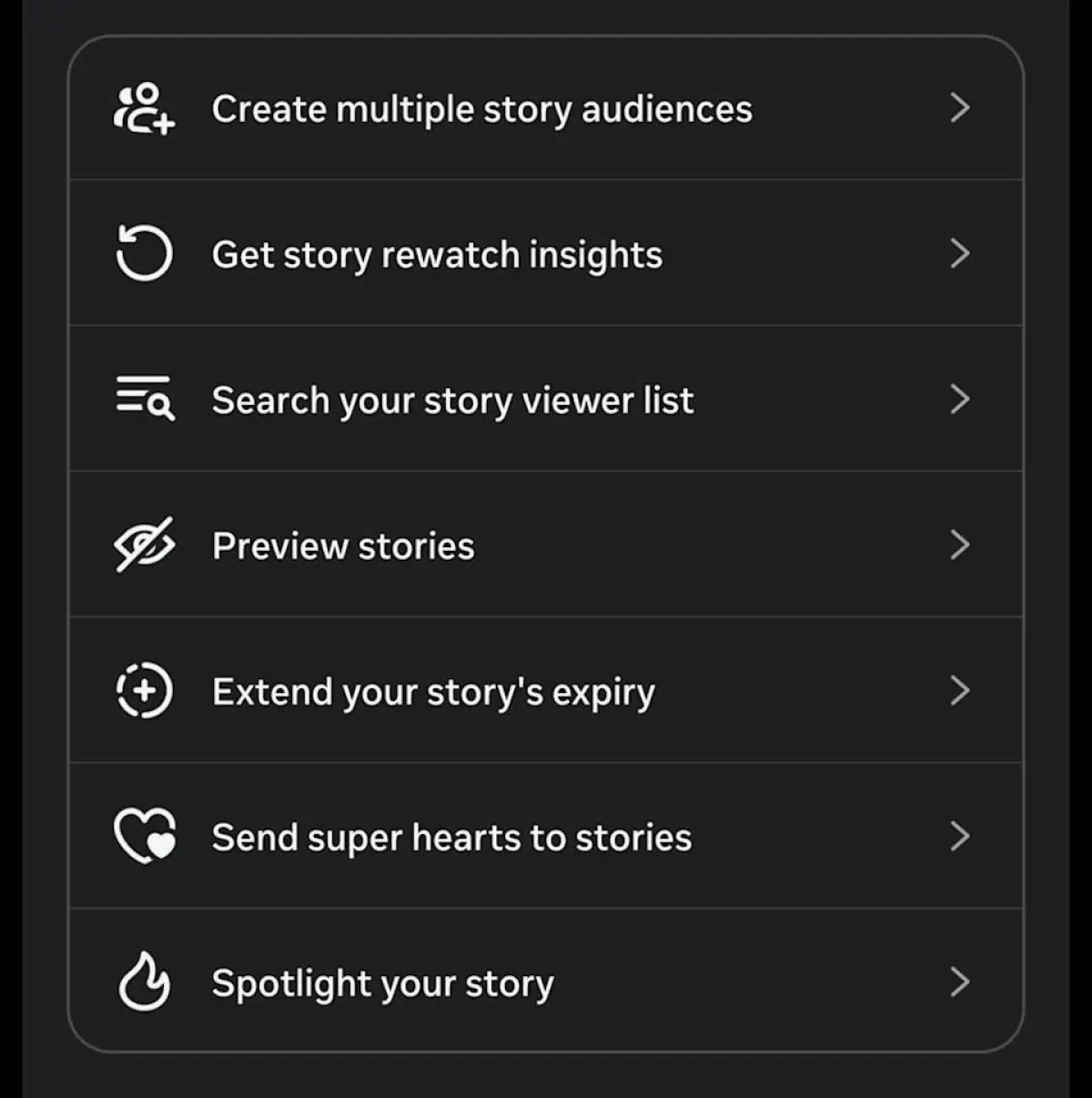 Dia juga mengonfirmasi daftar fitur yang ditunjukkan di bawah ini, dan menambahkan bahwa pratinjau (preview) akan memungkinkan orang untuk melihat sebagian Stories pengguna lain tanpa muncul sebagai penonton (anonymous) dan bahwa postingan Stories dapat diperpanjang selama 24 jam tambahan.